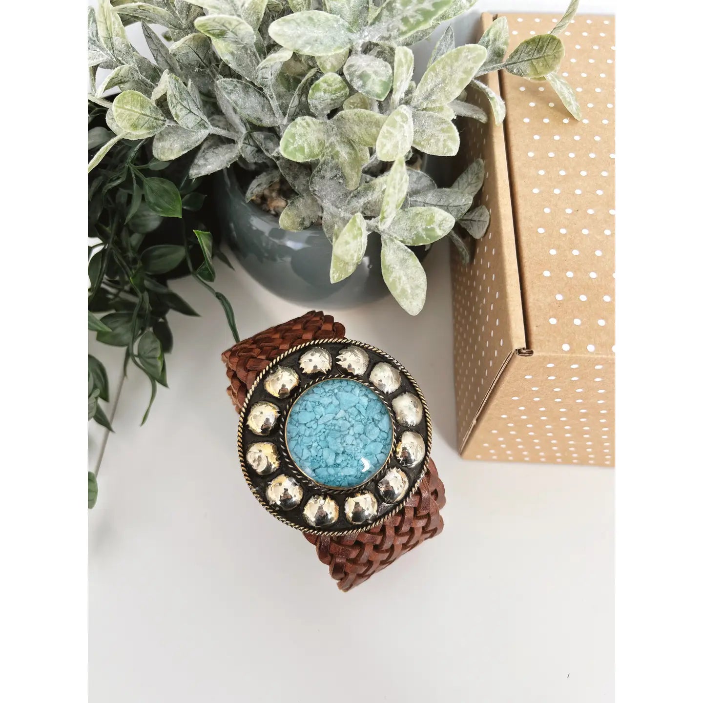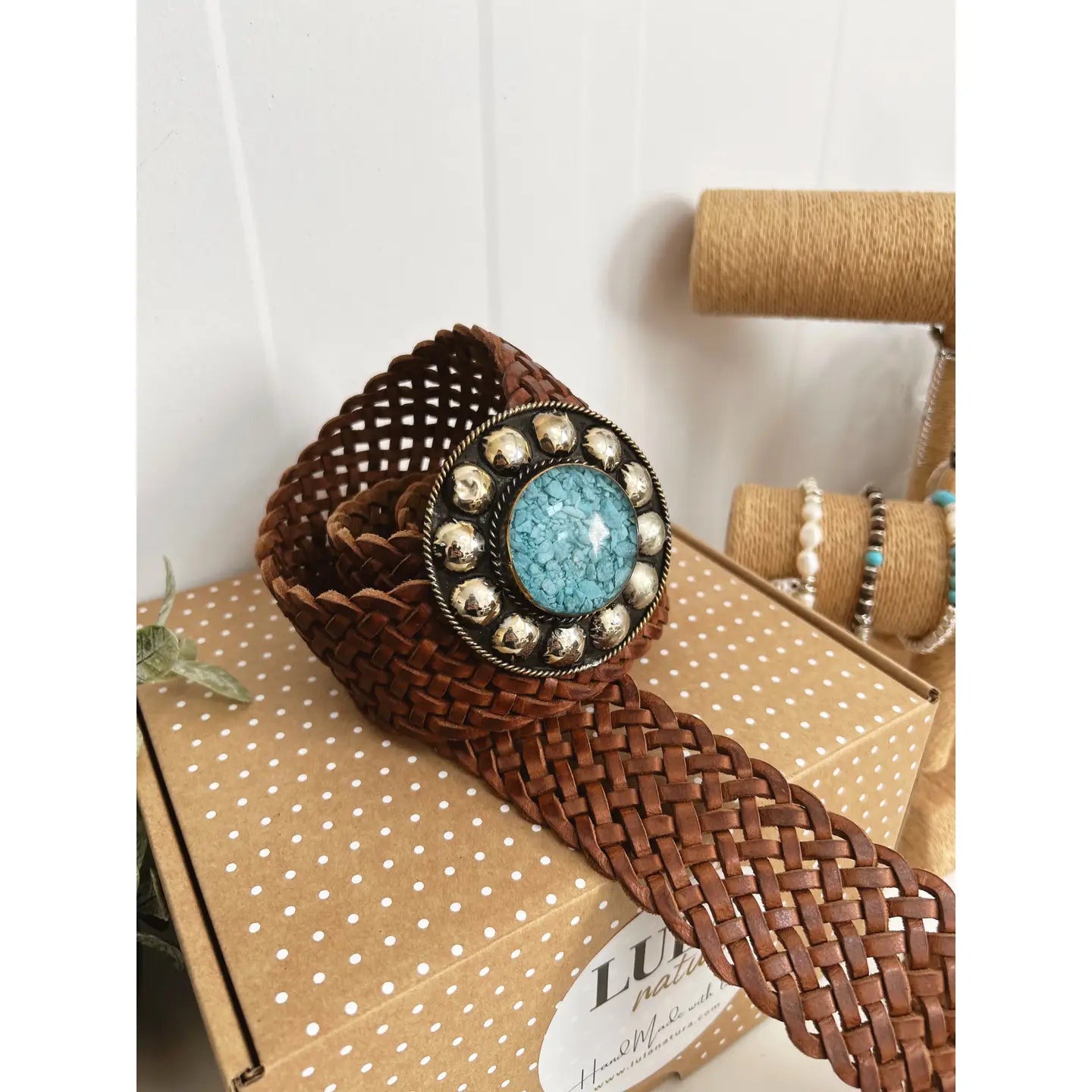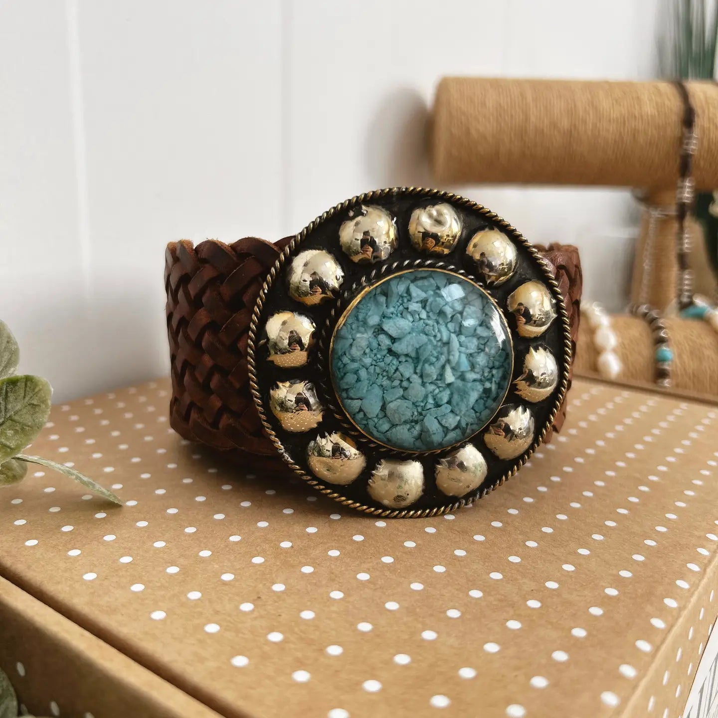 Braunes Echtleder, eine runde Messingschließe in Form einer Blüte, verziert mit leuchtend türkisfarbenen Steinen. Dieses Accessoire ist das perfekte Detail, um sommerliche Outfits und Boho-Looks mit einem Hauch Wildheit zu vollenden.