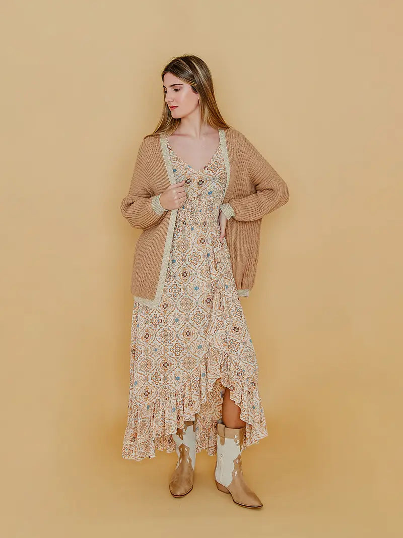 Langes, bedrucktes Kleid in Braun mit V-Ausschnitt. Bohokleid